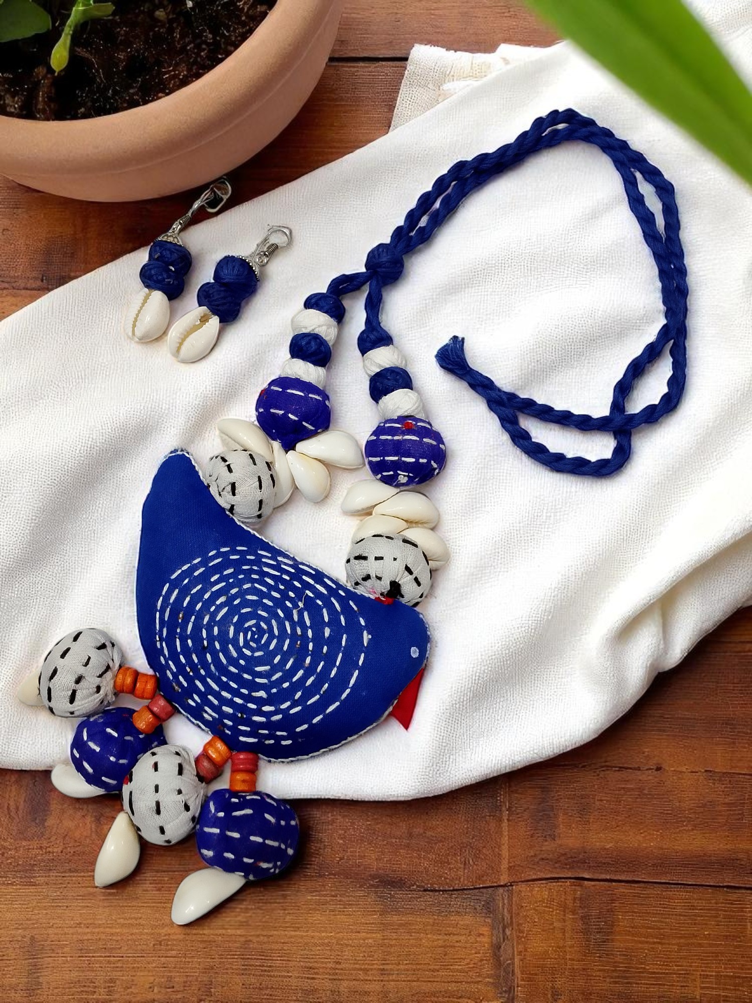 Colorful Handcrafted Fabric Blue Bird Necklace & Earring Set