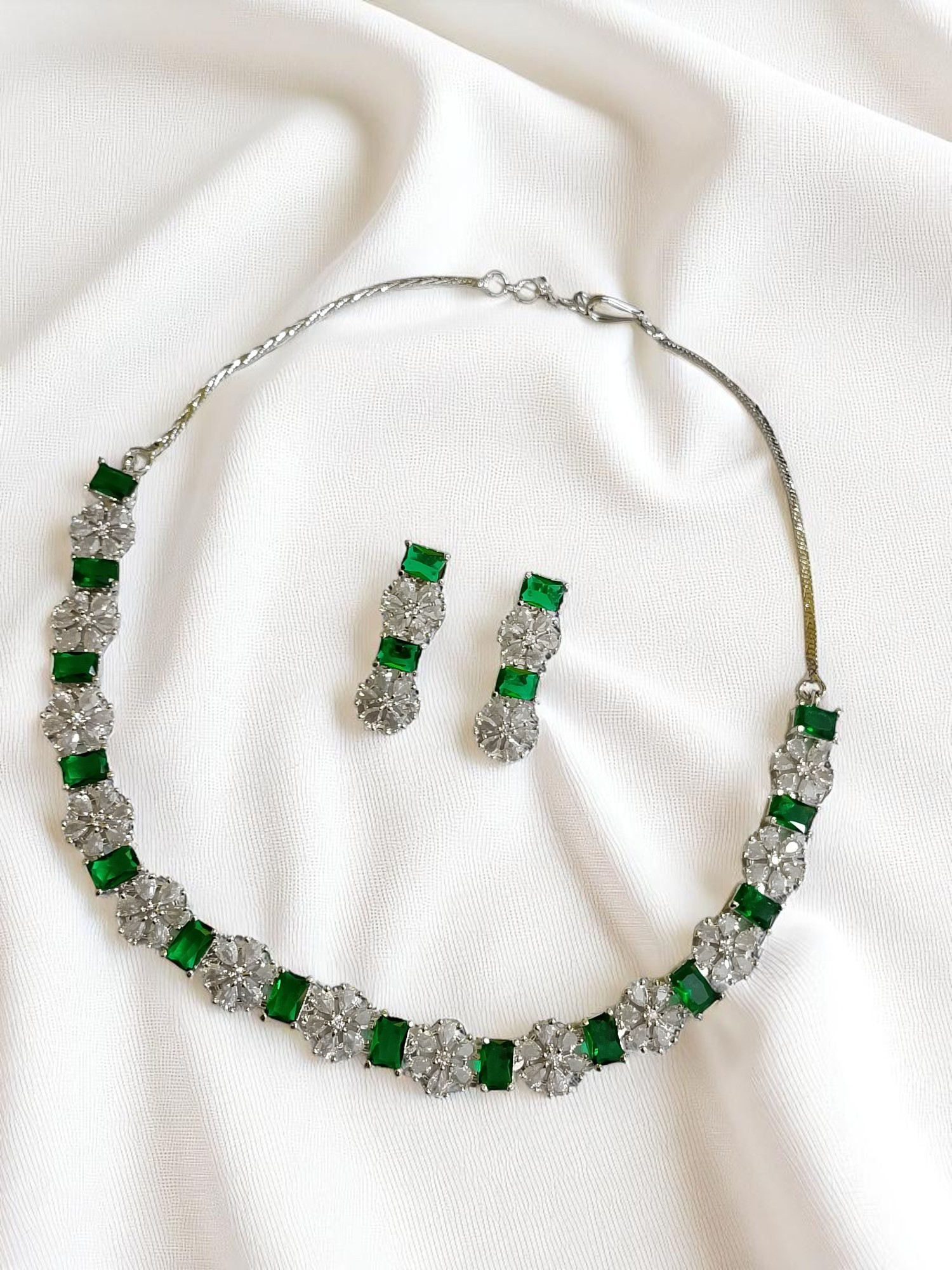 Green & White Ad Stone Necklace with Earring Set