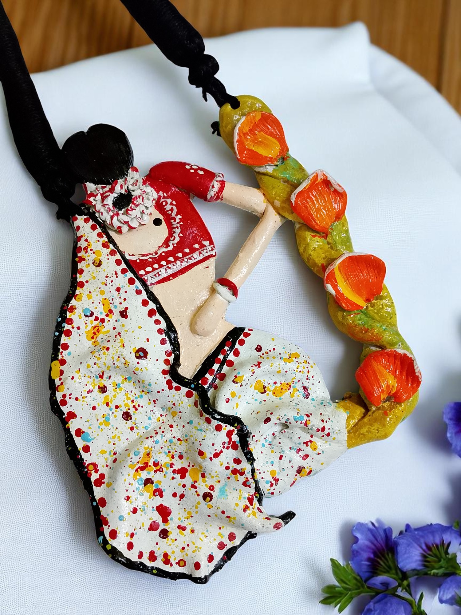 Handmade Necklace Featuring Woman in White Saree | Clay Art Statement Necklace | Boho Folk Jewelry Set
