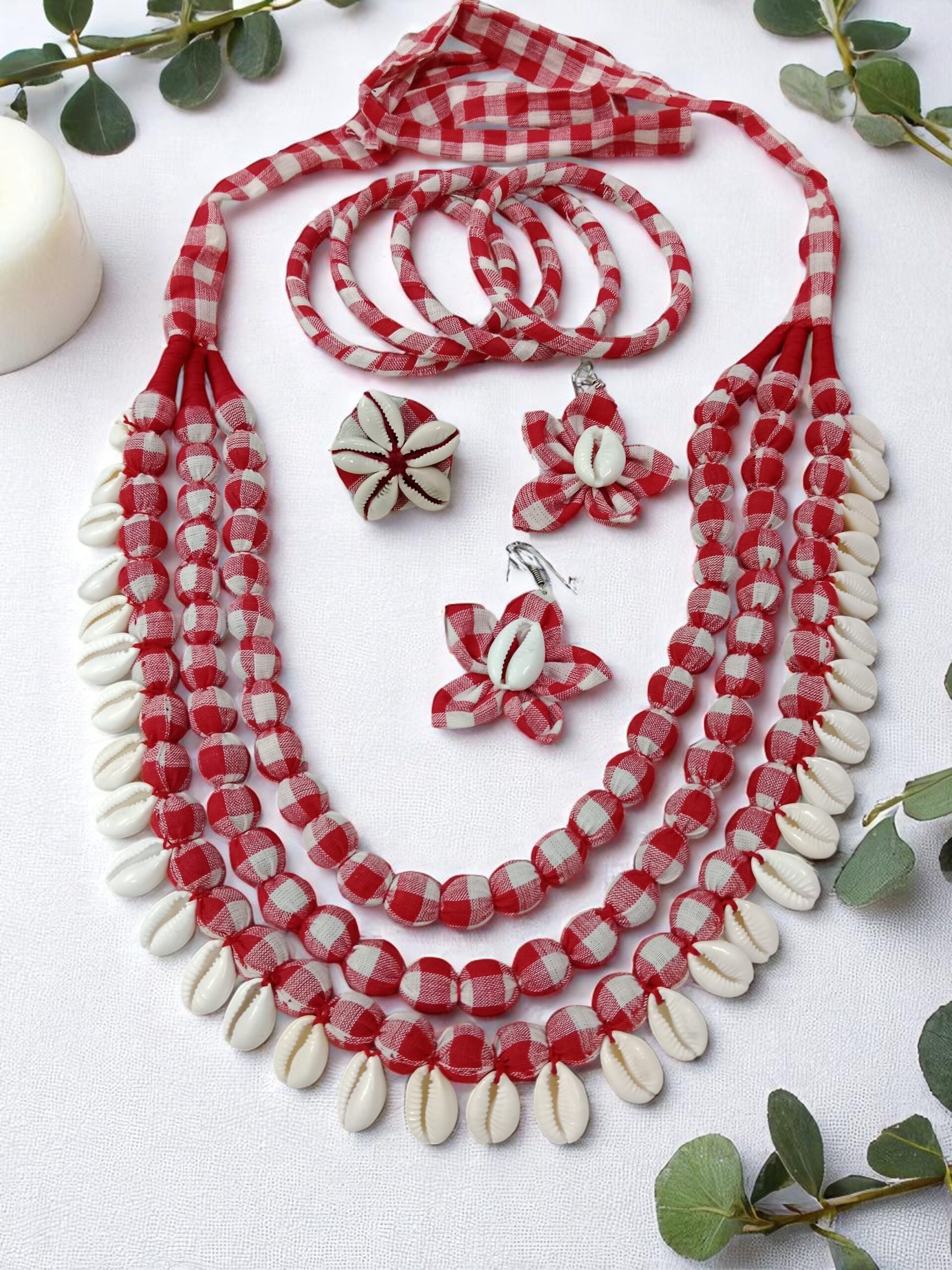 Handmade Red & White Cotton Fabric Jewelry Set with Cowrie Shells (Necklace, Ring, Earrings)