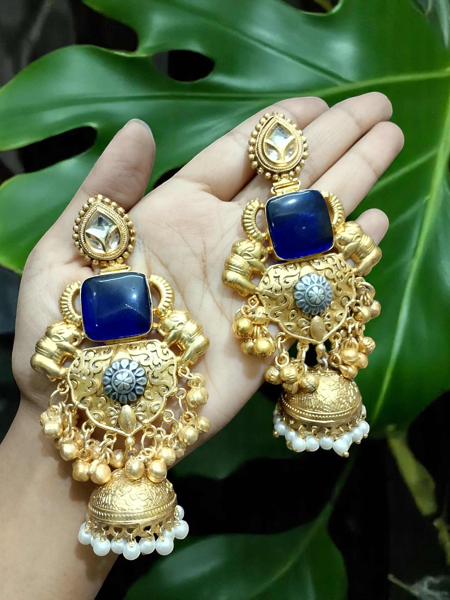 Design Elements: Detailed elephant carvings, antique silver floral centerpiece, and ornate jhumka bell with pearl fringe