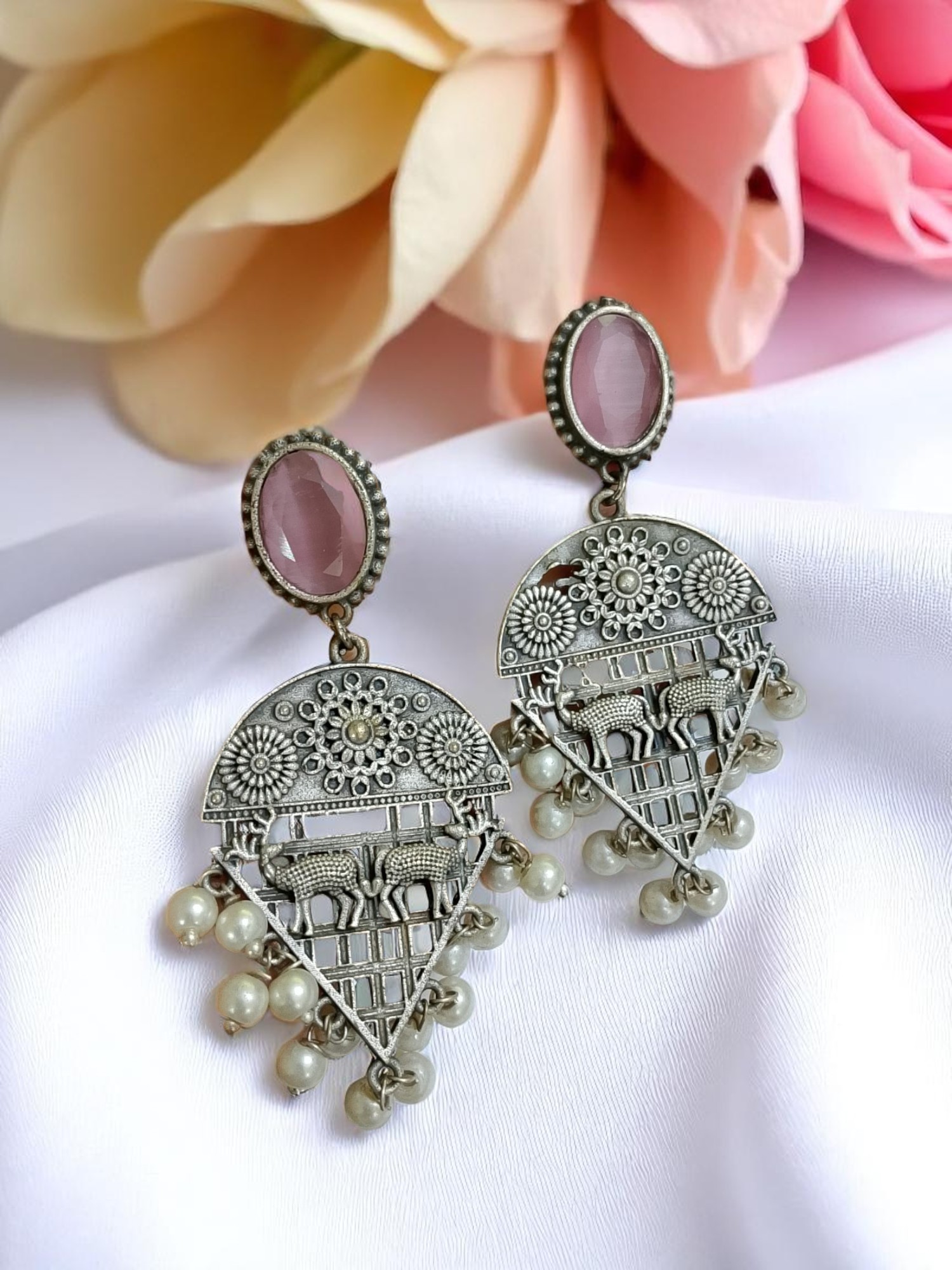 Pink Blue Stone Oxidised Earrings with Pearl Drops