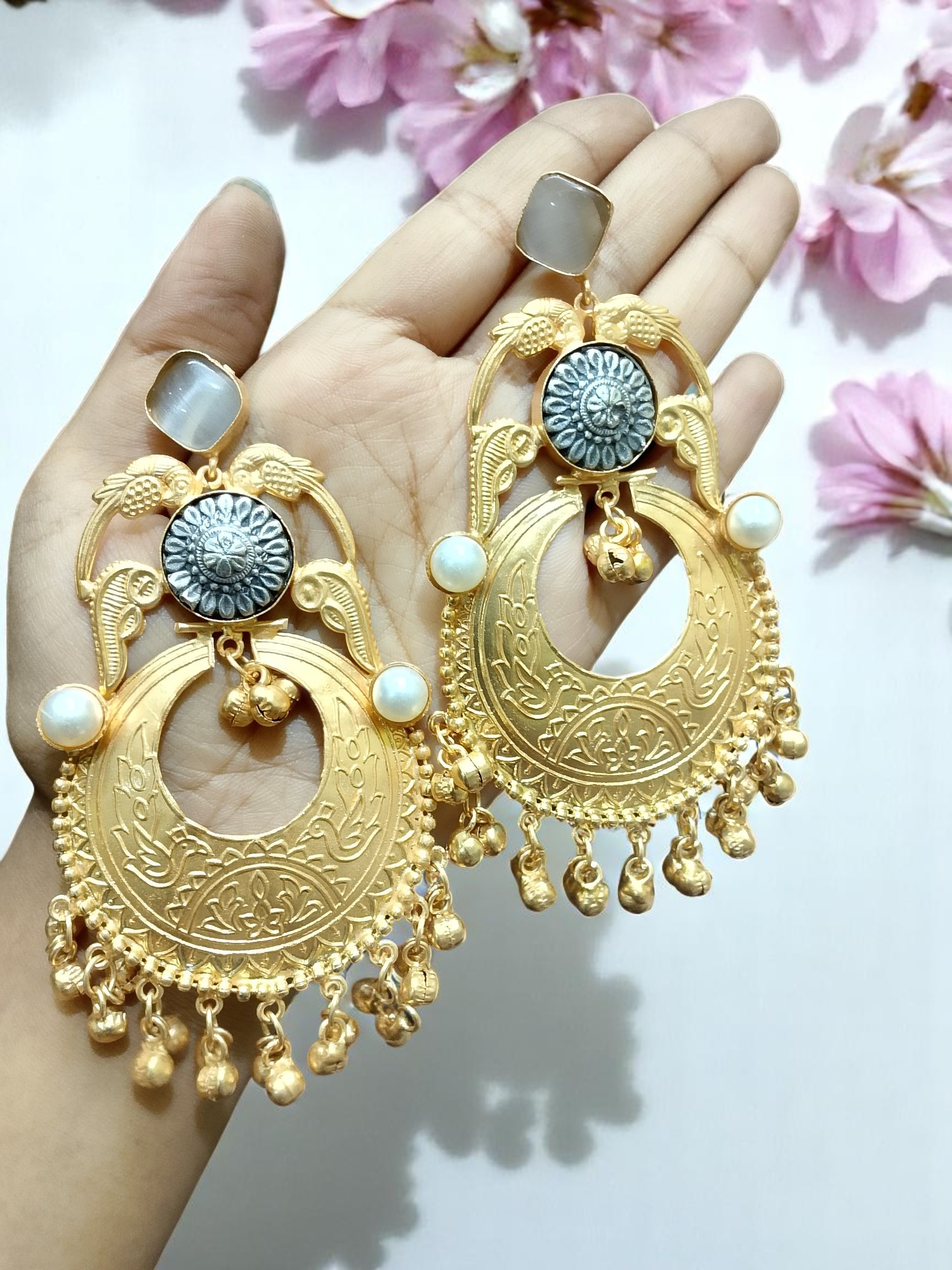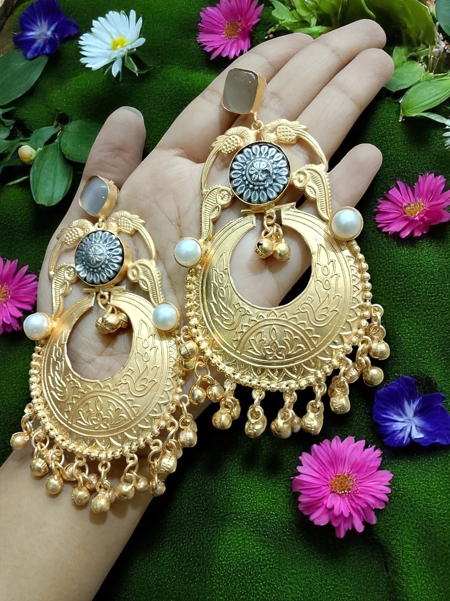 Design: Traditional crescent-shaped chandbali style with detailed floral etching
