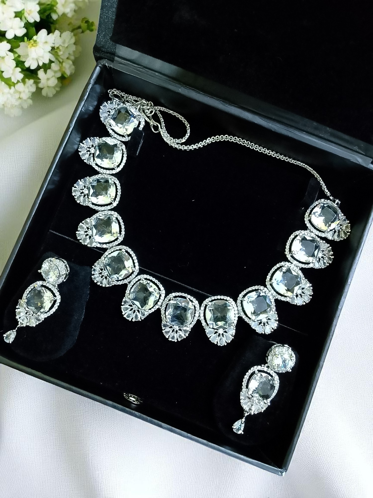 White Ad Stone Necklace With Earring Pair